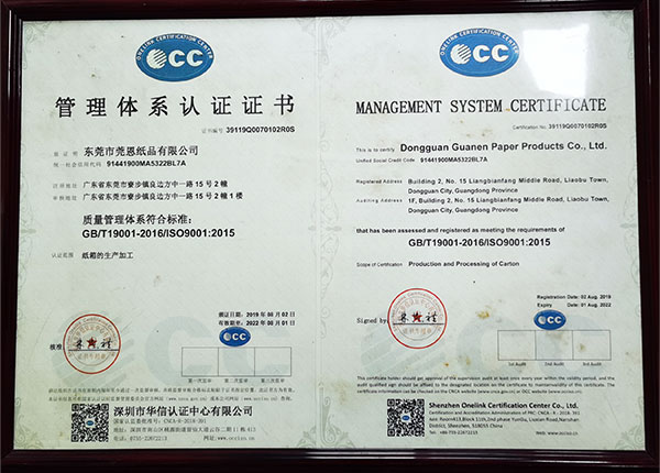 工厂位于地理位置优越交通便利的东莞寮步镇,我司是集制造、销售、服务于一体的专业纸箱包装企业。并先后通过了ISO9001:2000国际质量体系、ISO14000国际环境体系等认证。